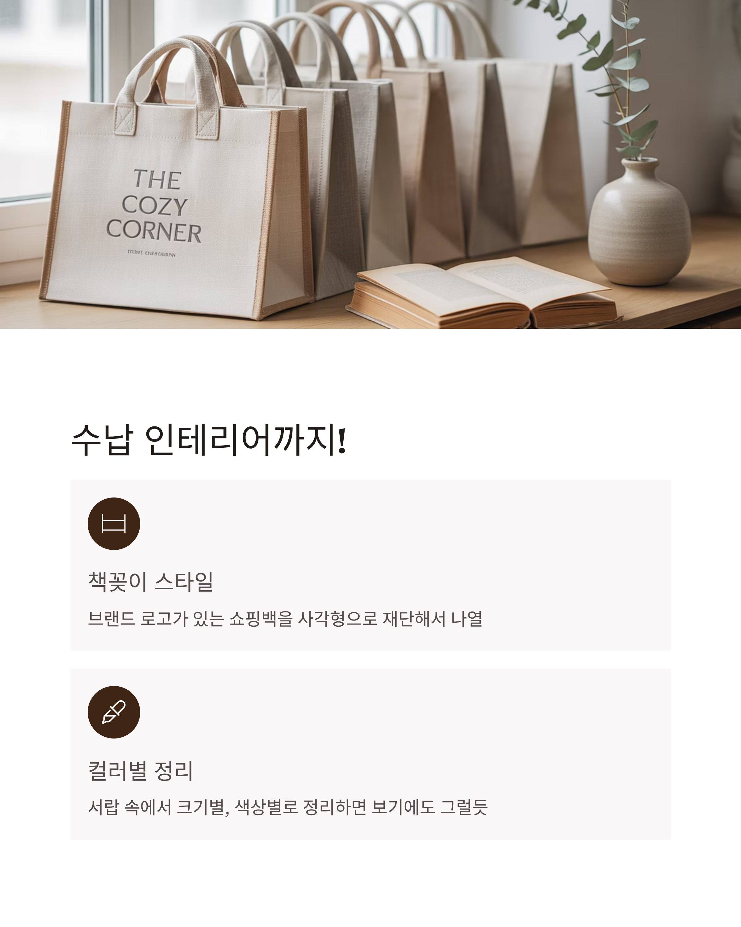 | 잡화 수납함 | 욕실, 거실 | 쇼핑백+내부 보강지 | 양말/화장품 분류 |