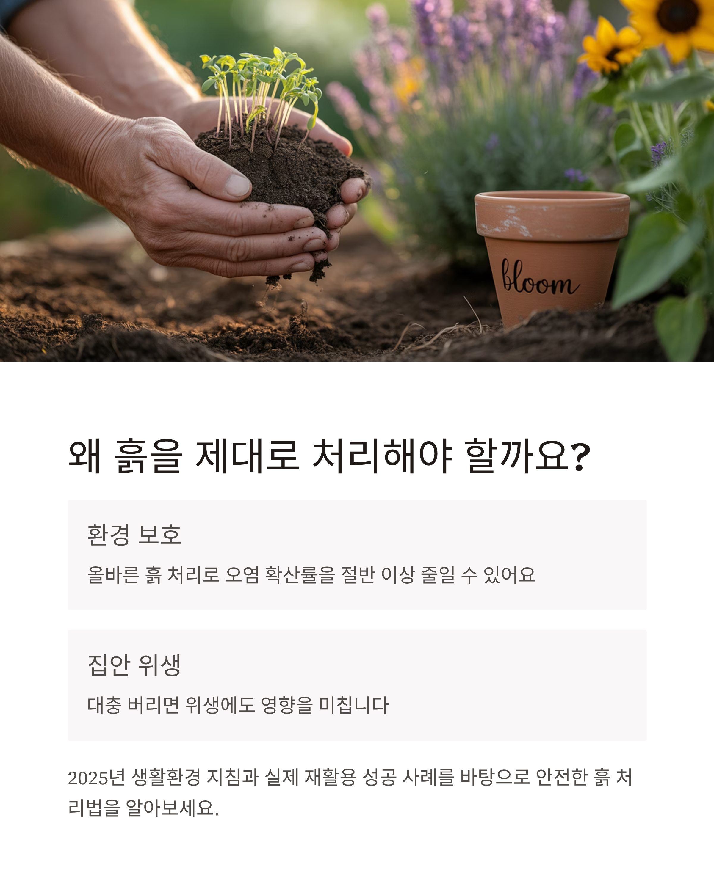 화분 분갈이를 하고 남은 흙, 대충 버리기엔 환경에도 안 좋고 집안 위생에도 영향이 큽니다. 실제로 2025년 생활환경 지침에 따르면 올바른 흙 처리만으로도 오염 확산률을 절반 이상 줄일 수 있다고 하는데요. 이번 글에서는 지자체 가이드라인과 실제 재활용 성공 사례를 토대로, 흙을 건강하게 재활용하고 안전하게 버리는 방법을 알기 쉽게 정리했습니다.