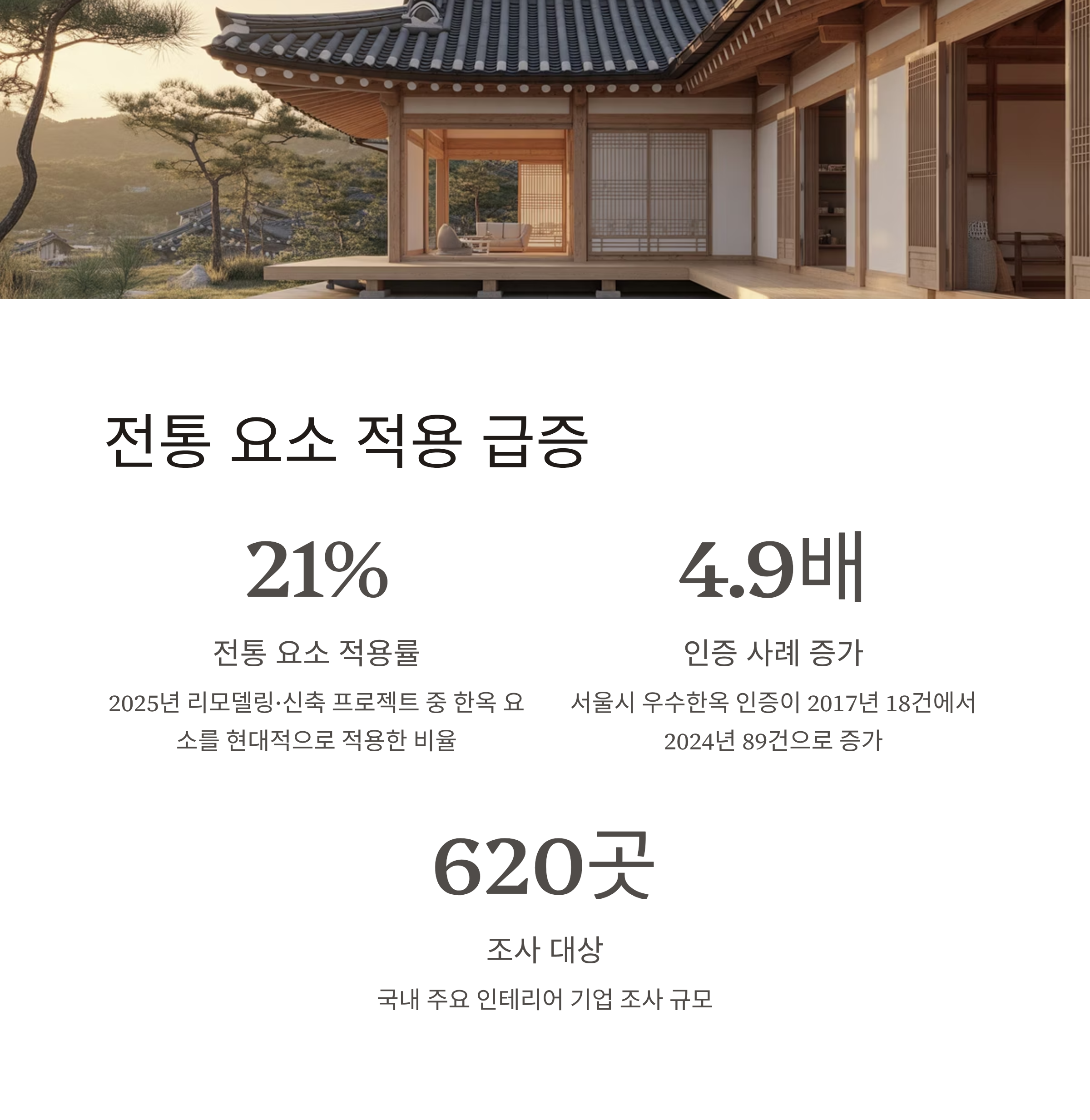 국내 주요 인테리어 기업 620곳을 대상으로 한 조사에 따르면, 2025년 기준 리모델링·신축 프로젝트의 약 21%가 한옥 요소를 현대적으로 적용하고 있습니다.