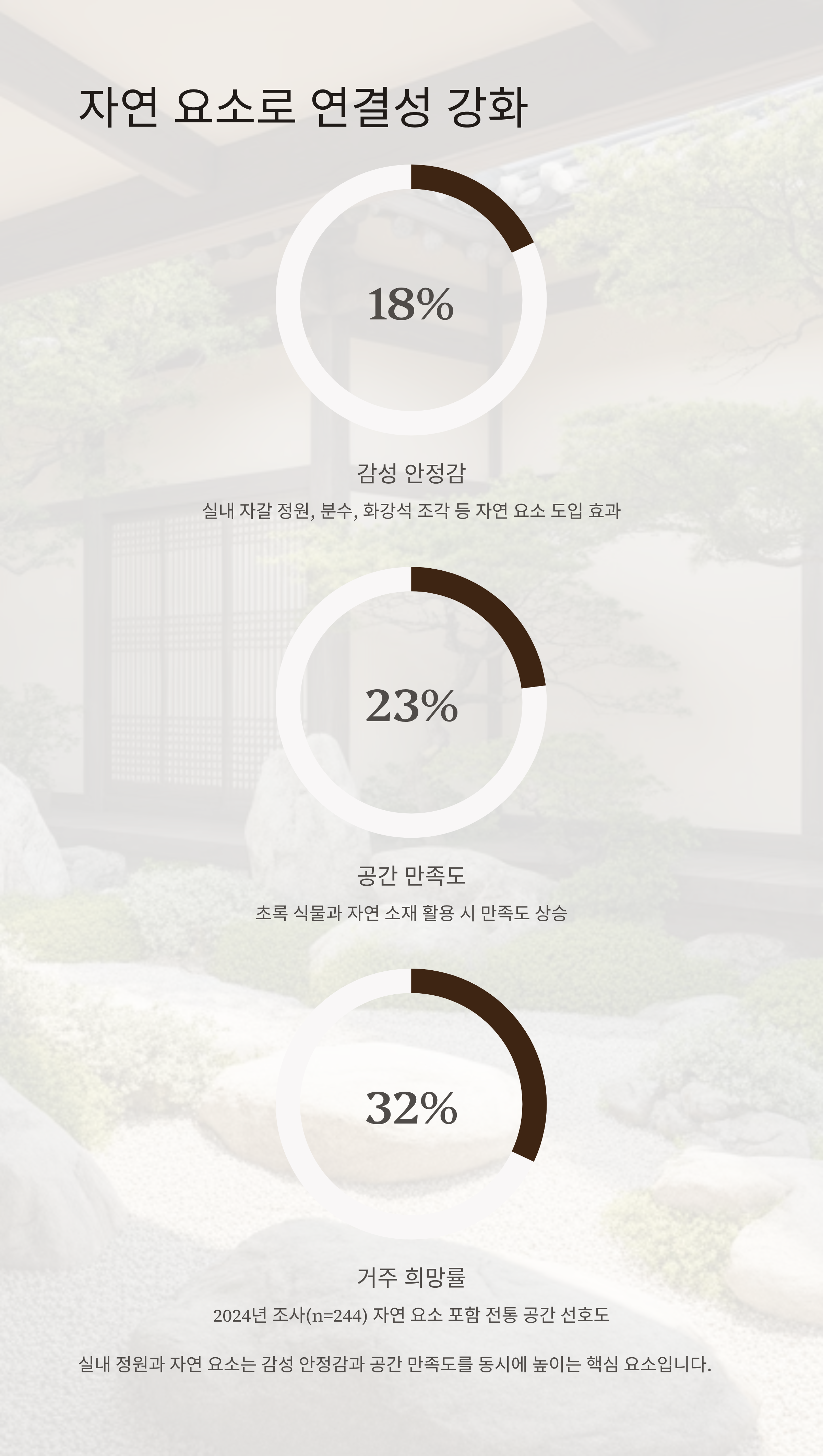 2024년 체감 조사(n=244)에서는 자연 요소가 포함된 전통 공간의 거주 희망률이 32% 증가한 것으로 나타났습니다.