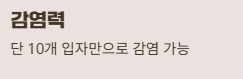 | 감염 최소 입자 수 | 단 10개 입자만으로도 감염 가능 |