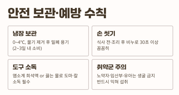 | 도구 소독 | 염소계 희석액 or 끓는 물로 도마·칼 소독 필수 |