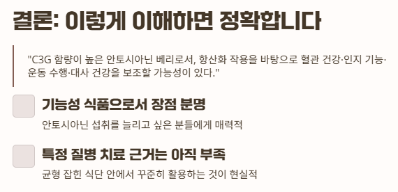 “C3G 함량이 높은 안토시아닌 베리로서, 항산화 작용을 바탕으로 혈관 건강, 인지 기능, 운동 수행, 대사 건강을 보조할 가능성이 있다.”