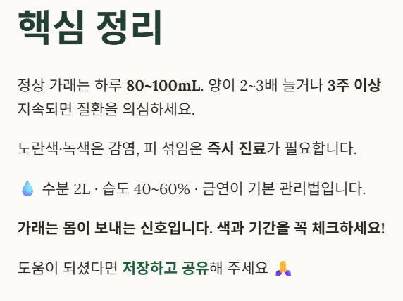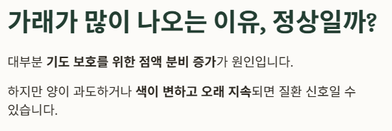 | 환경·생활 | 환절기, 건조, 수분 부족(1.5L↓), 미세먼지, 흡연 | 하얀·끈적 |
