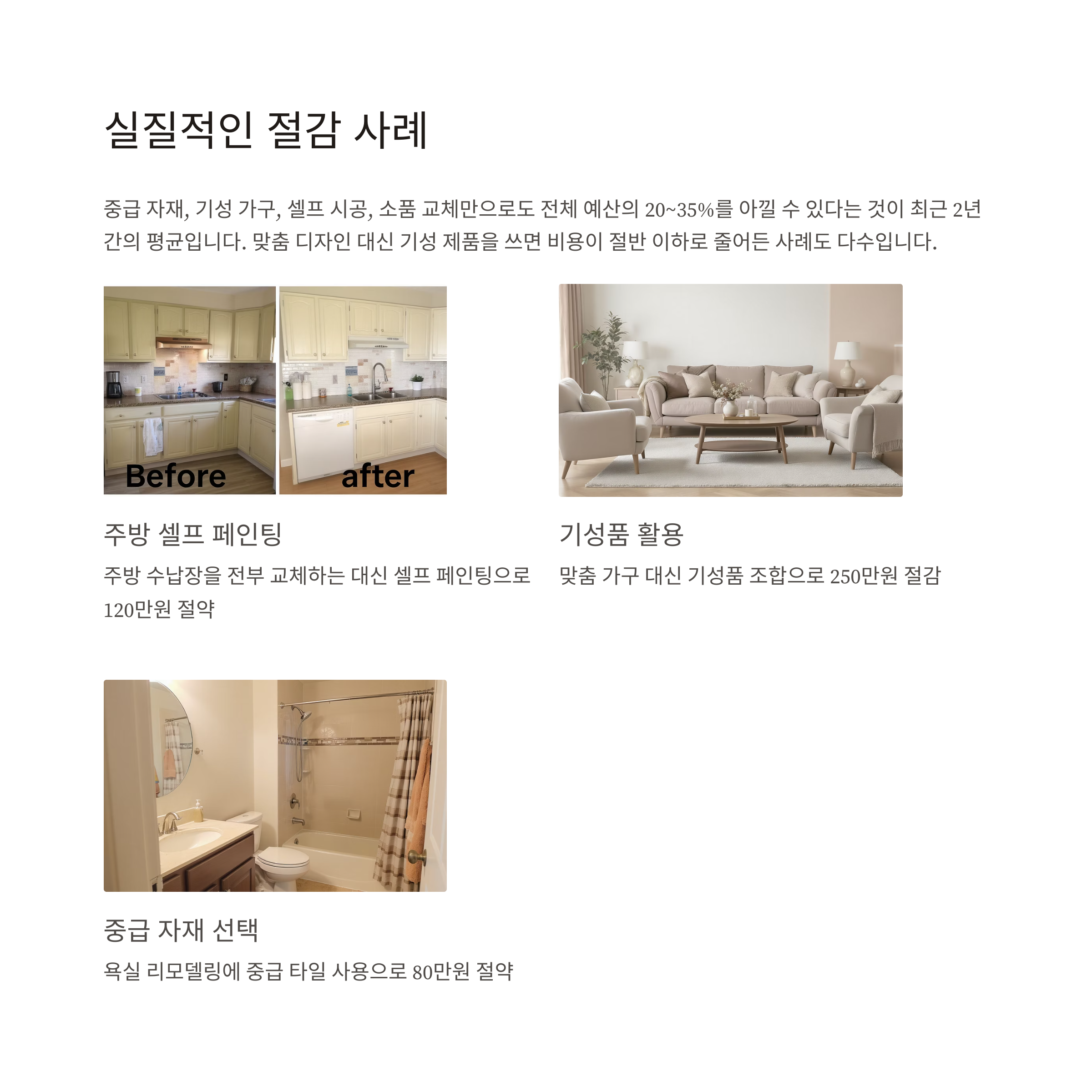 중급 자재, 기성 가구, 셀프 시공, 소품 교체만으로도 전체 예산의 20~35%를 아낄 수 있다는 것이 최근 2년간의 평균입니다. 맞춤 디자인 대신 기성 제품을 쓰면 비용이 절반 이하로 줄어든 사례도 다수입니다.
