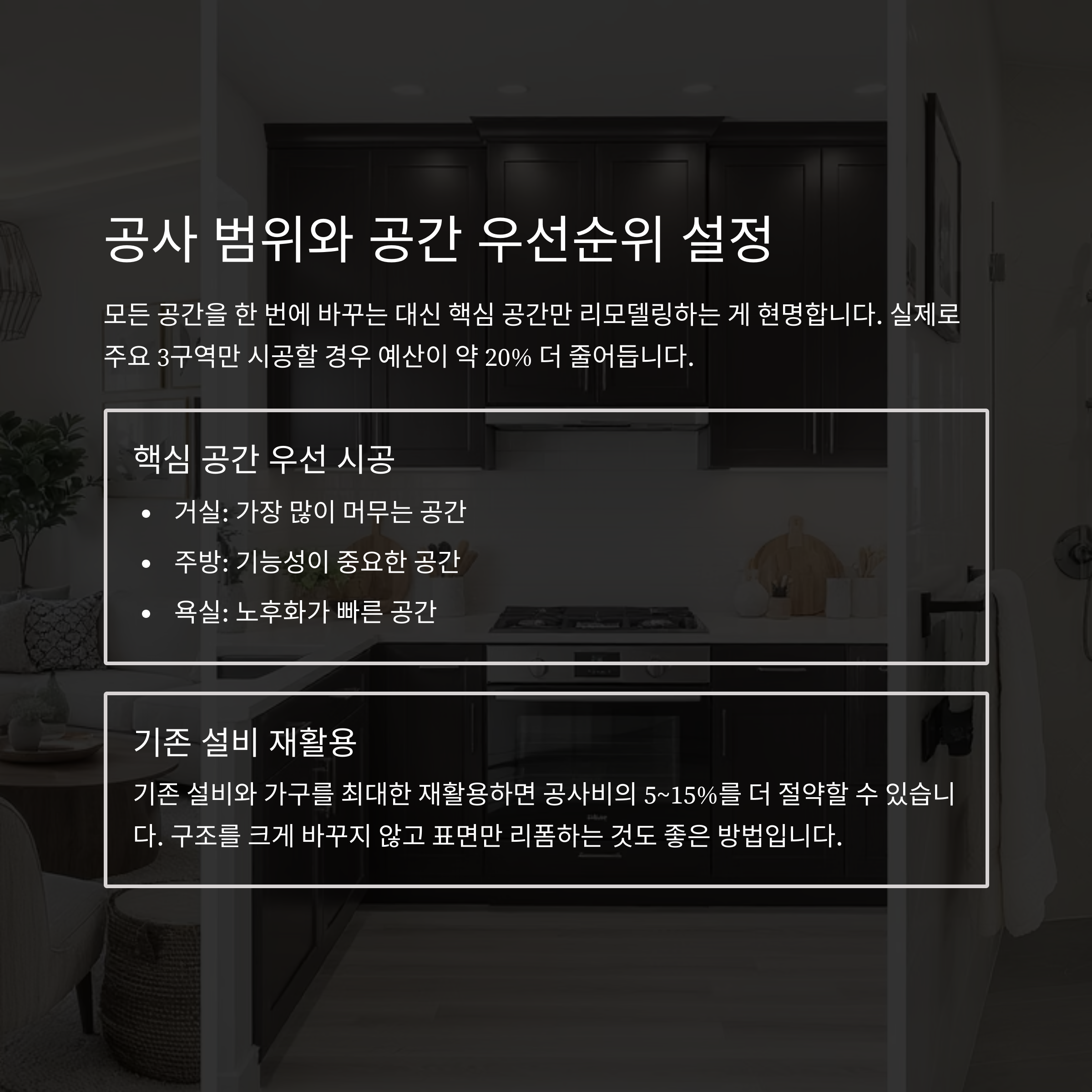 모든 공간을 한 번에 바꾸는 대신 거실, 주방, 욕실처럼 핵심 공간만 리모델링하는 게 현명합니다. 실제로 주요 3구역만 시공할 경우 예산이 약 20% 더 줄어듭니다. 아울러 기존 설비와 가구를 최대한 재활용하면 공사비의 5~15%를 더 절약할 수 있습니다.