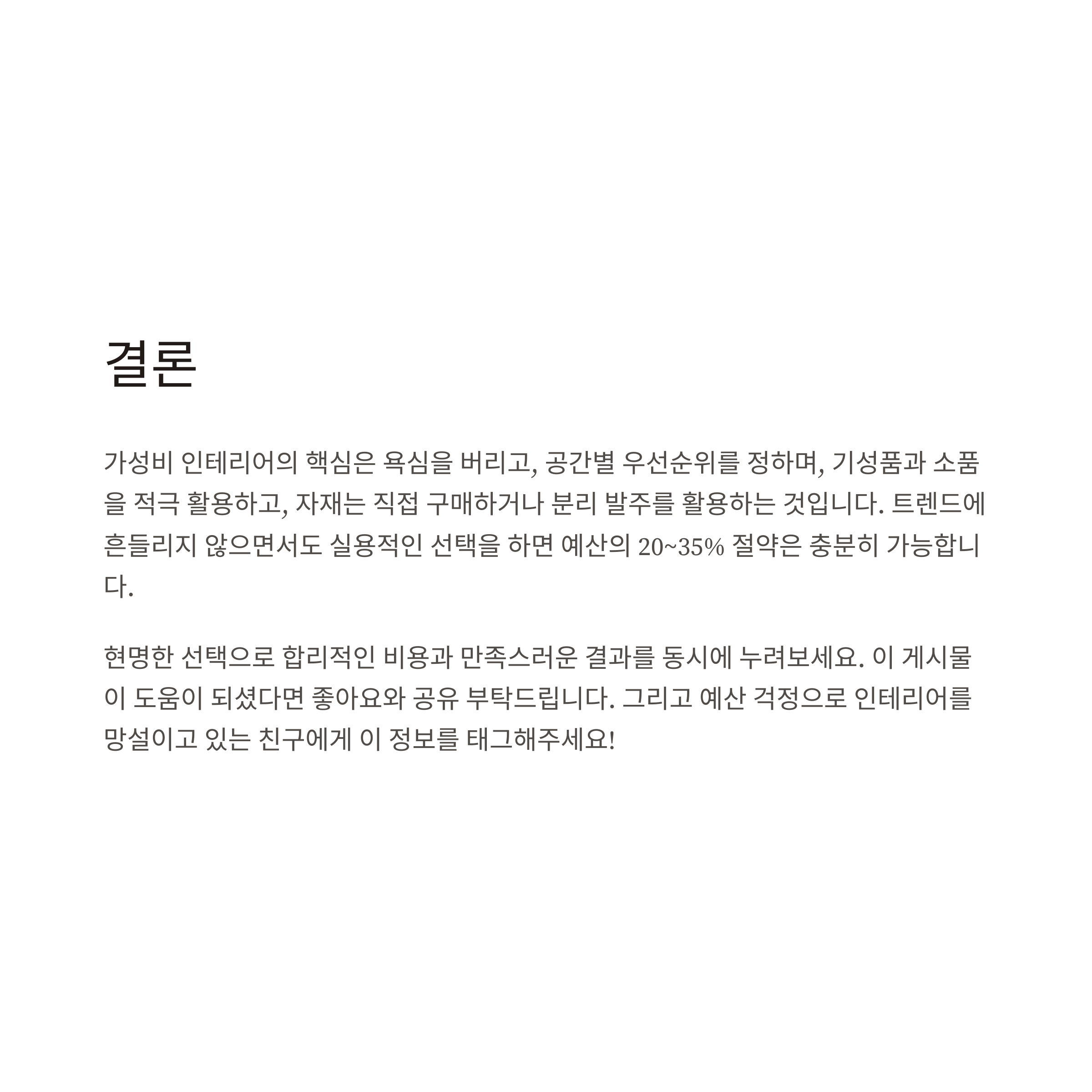 가성비 인테리어의 핵심은 욕심을 버리고, 공간별 우선순위를 정하며, 기성품과 소품을 적극 활용하고, 자재는 직접 구매하거나 분리 발주를 활용하는 것입니다. 트렌드에 흔들리지 않으면서도 실용적인 선택을 하면 예산의 20~35% 절약은 충분히 가능합니다. 현명한 선택으로 합리적인 비용과 만족스러운 결과를 동시에 누려보세요.