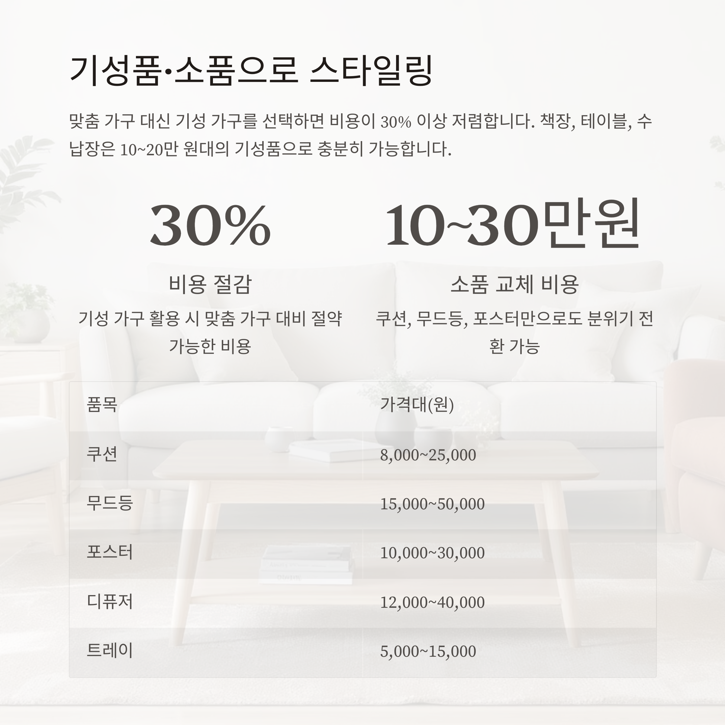 맞춤 가구 대신 기성 가구를 선택하면 비용이 30% 이상 저렴합니다. 책장, 테이블, 수납장은 10만~20만 원대의 기성품으로 충분히 가능하고, 쿠션·무드등·포스터 같은 소품만 교체해도 새로운 분위기를 만들 수 있습니다. 소품 비용은 10~30만 원 선에서 충분히 가능해 가성비 효과가 높습니다.