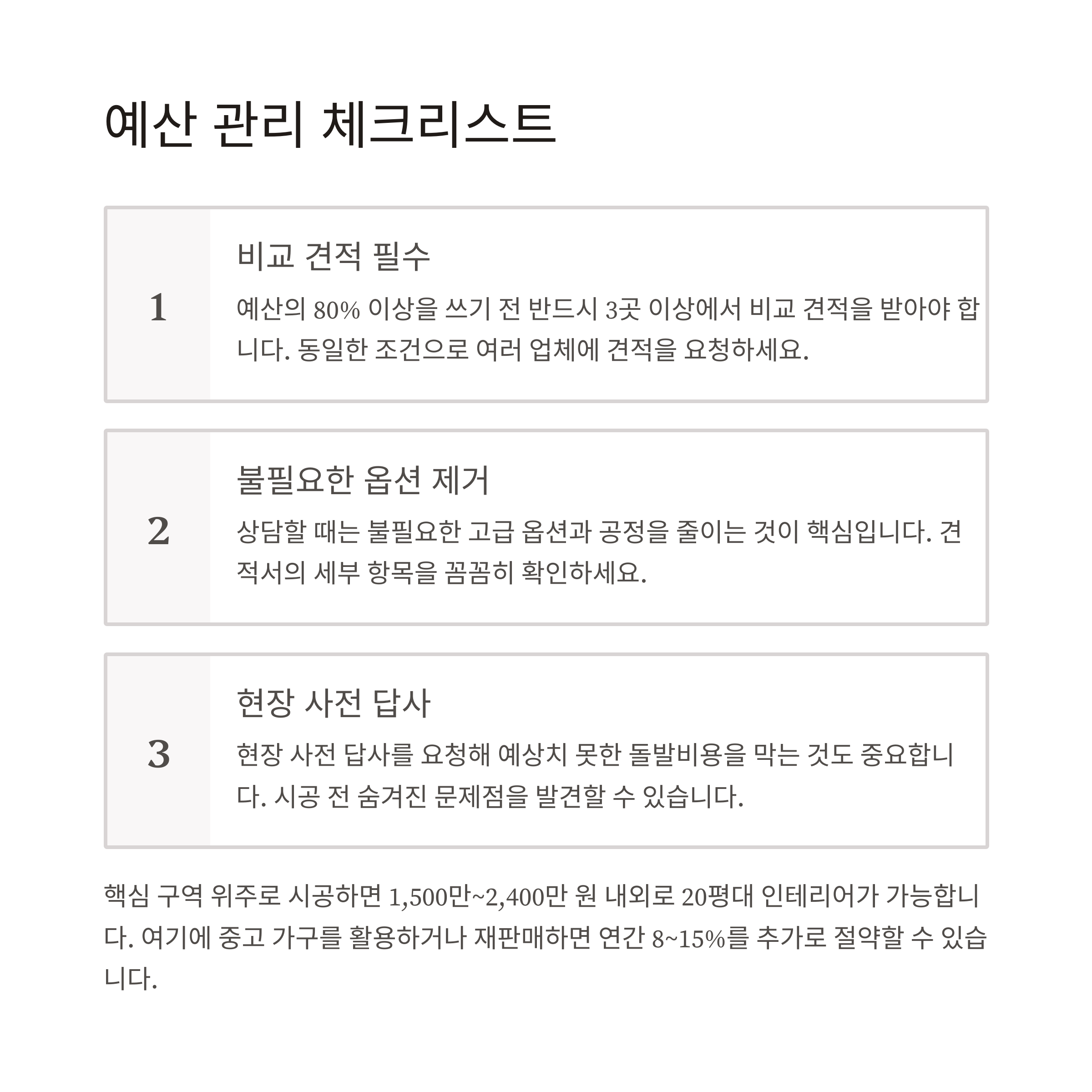 예산의 80% 이상을 쓰기 전 반드시 3곳 이상에서 비교 견적을 받아야 합니다. 상담할 때는 불필요한 고급 옵션과 공정을 줄이는 것이 핵심입니다. 현장 사전 답사를 요청해 예상치 못한 돌발비용을 막는 것도 중요합니다. 핵심 구역 위주로 시공하면 1,500만~2,400만 원 내외로 20평대 인테리어가 가능합니다. 여기에 중고 가구를 활용하거나 재판매하면 연간 8~15%를 추가로 절약할 수 있습니다.