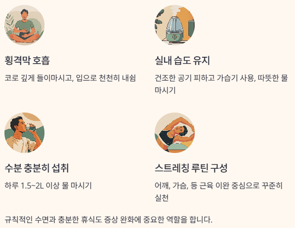 실내 습도 유지 건조한 공기 피하고 가습기 사용, 따뜻한 물 마시기