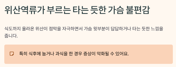 식도까지 올라온 위산이 점막을 자극하면서 가슴 윗부분이 답답하거나 타는 듯한 느낌을 줍니다.