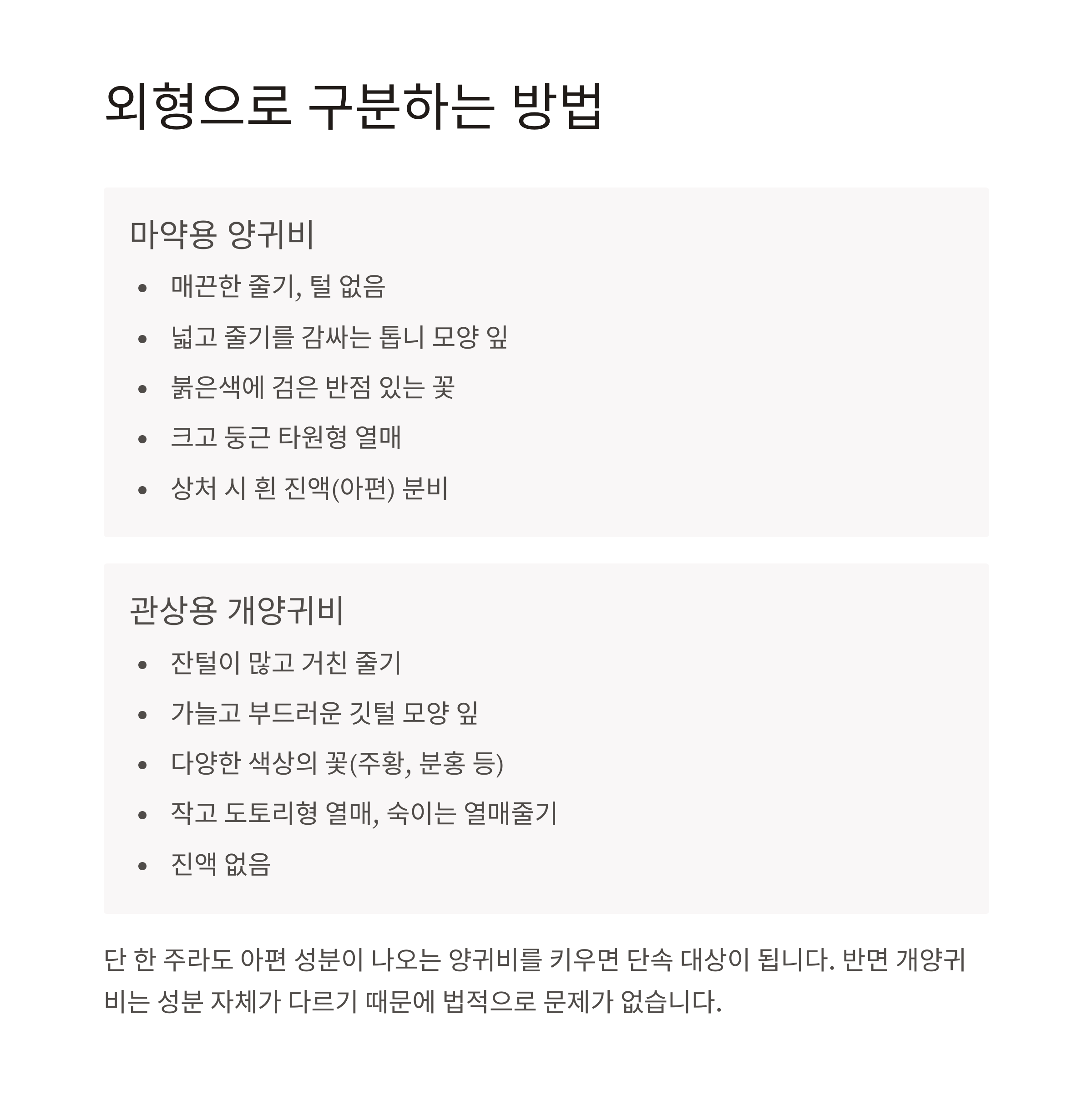 | 재배 목적 | 마약 원료, 재배 금지 | 관상용, 원예용으로 허용 |