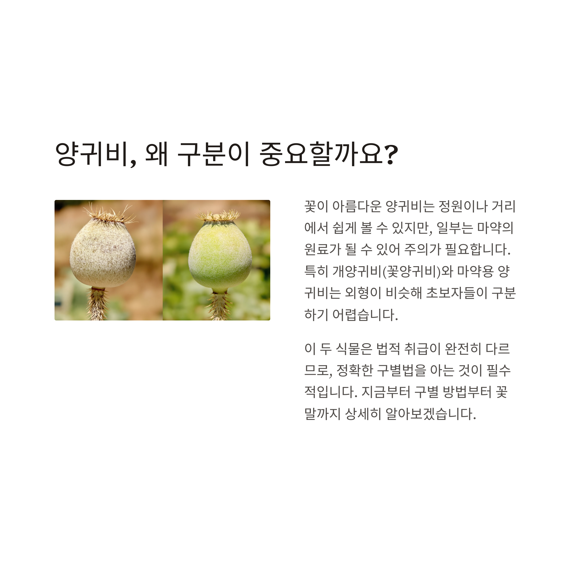 반면 개양귀비는 꽃이 비슷해 보일 수 있지만, 그 성분 자체가 다르기 때문에 법적으로 문제가 없습니다.