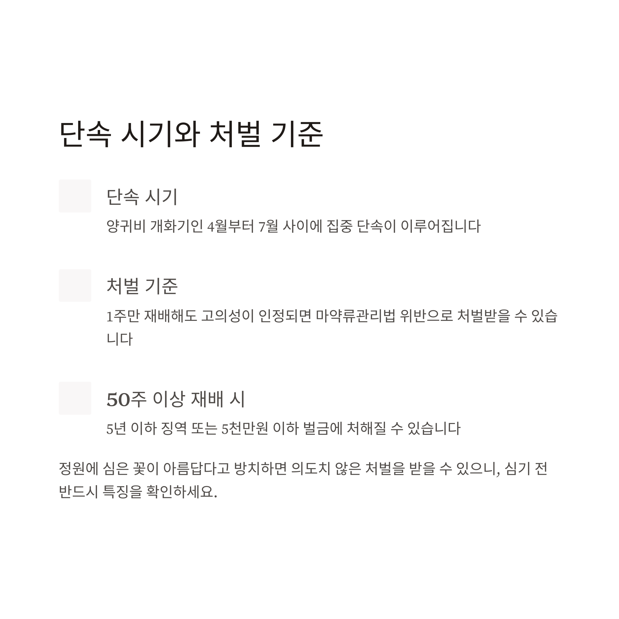 - 처벌: 1주 재배도 고의성이 인정되면 마약류관리법 위반