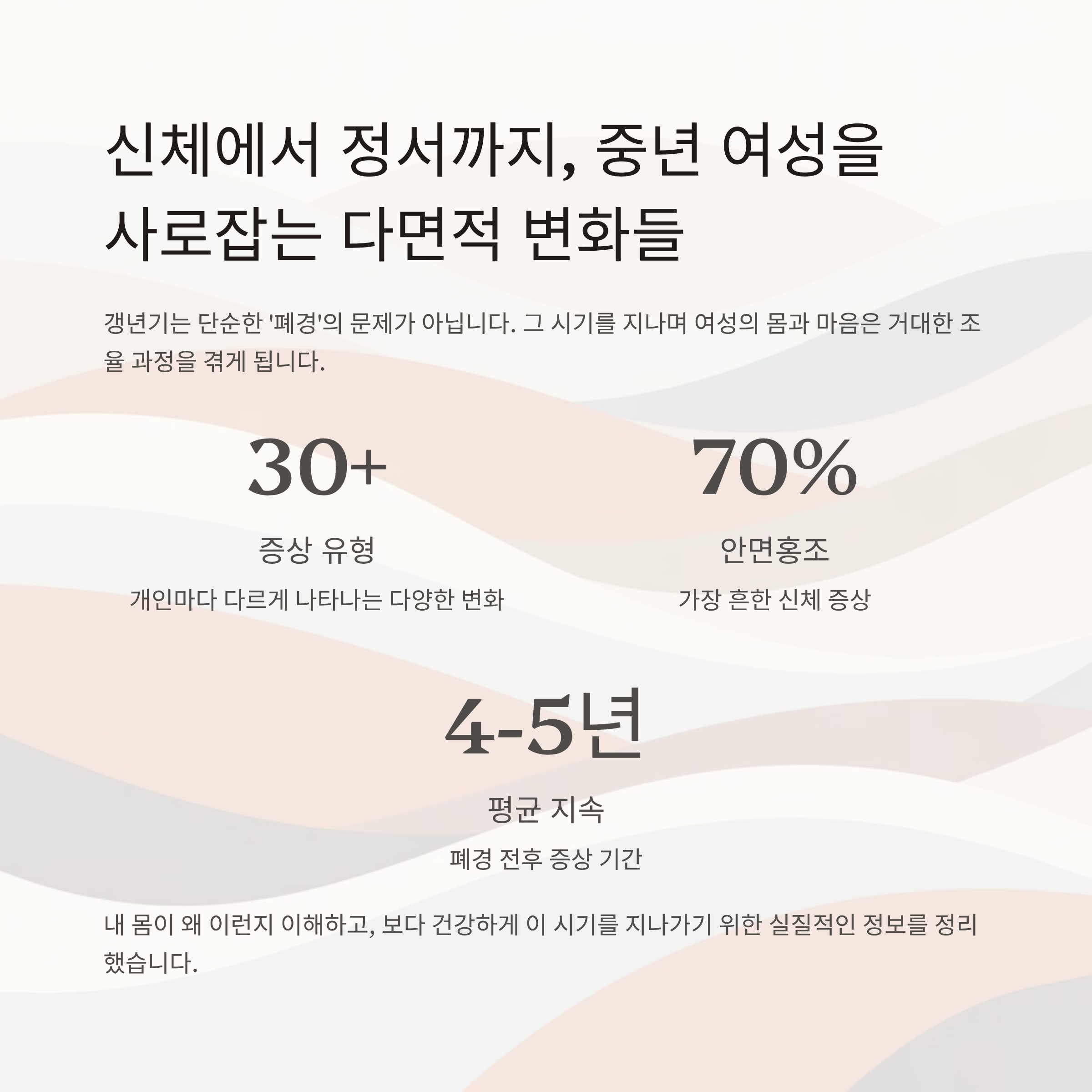 이 시기를 덜 고통스럽게, 더 건강하게 보내기 위해 필요한 것은 이해와 관리, 그리고 꾸준한 자기 돌봄입니다.