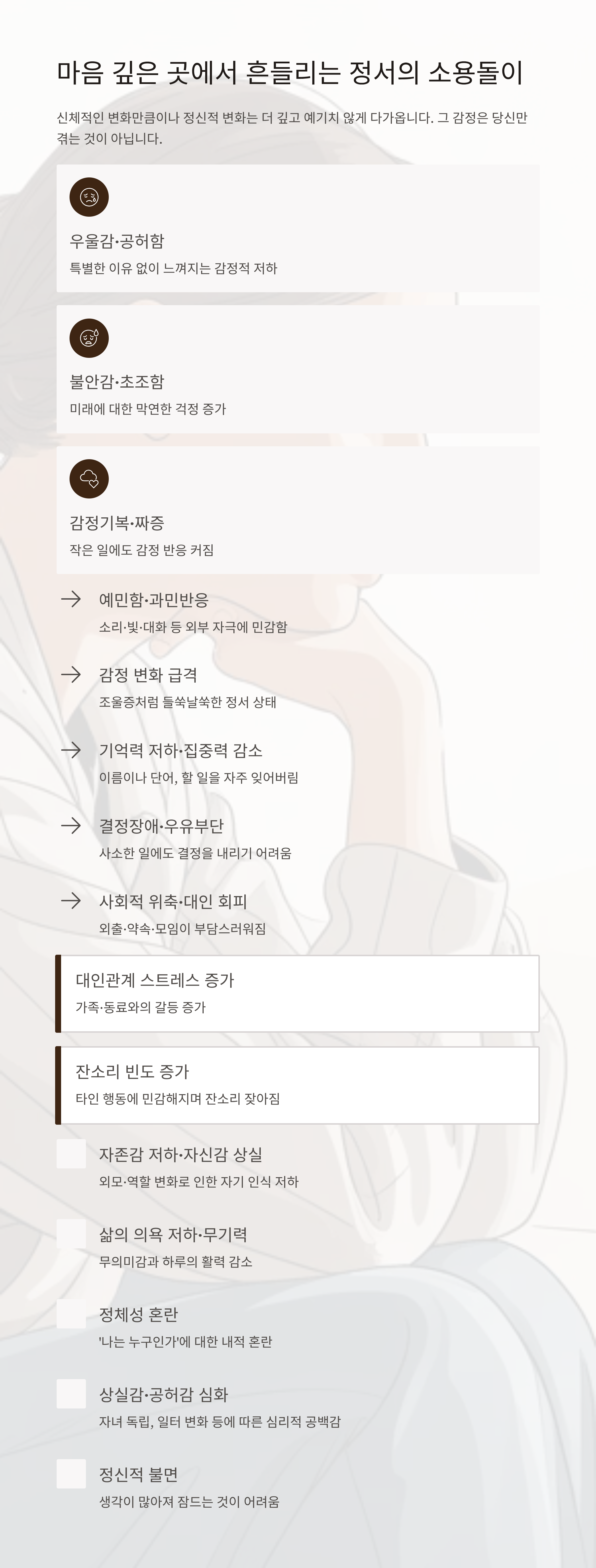| 16 | 우울감·공허함 | 특별한 이유 없이 느껴지는 감정적 저하 |