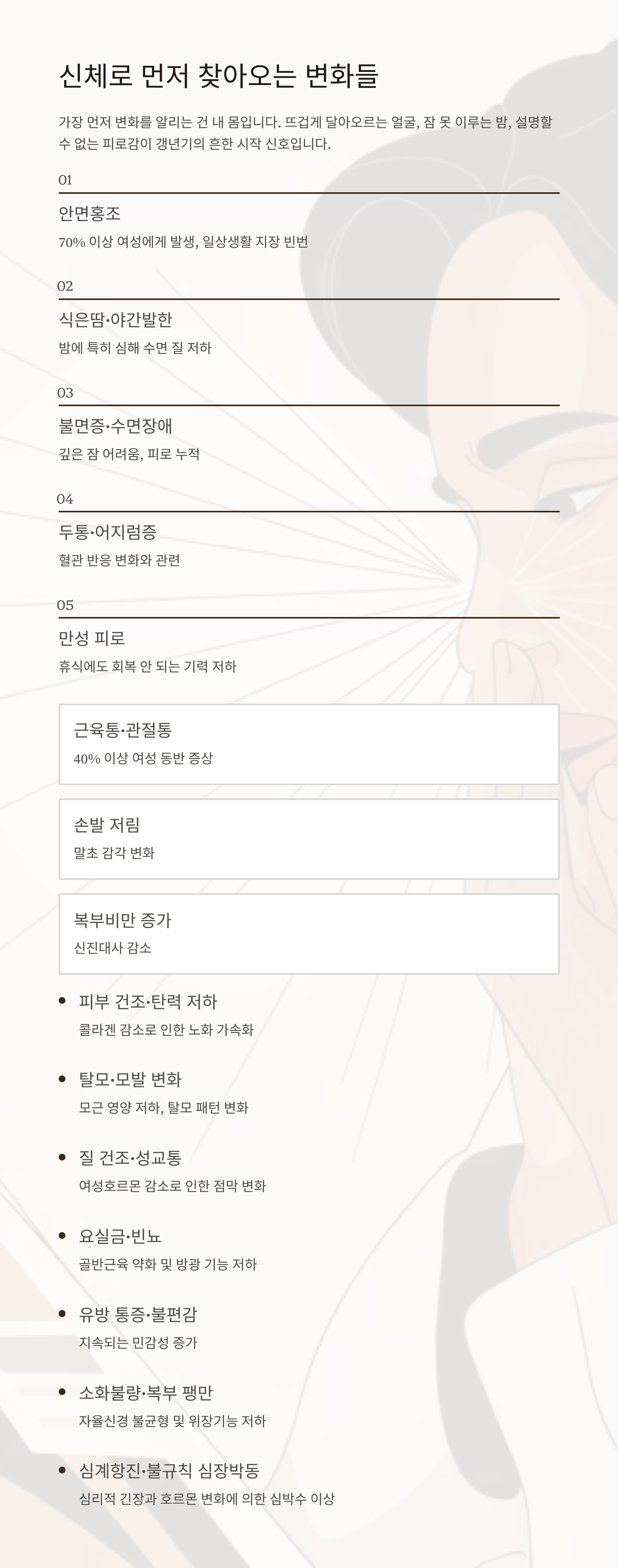 가장 먼저 변화를 알리는 건 내 몸입니다. 뜨겁게 달아오르는 얼굴, 잠 못 이루는 밤, 설명할 수 없는 피로감.