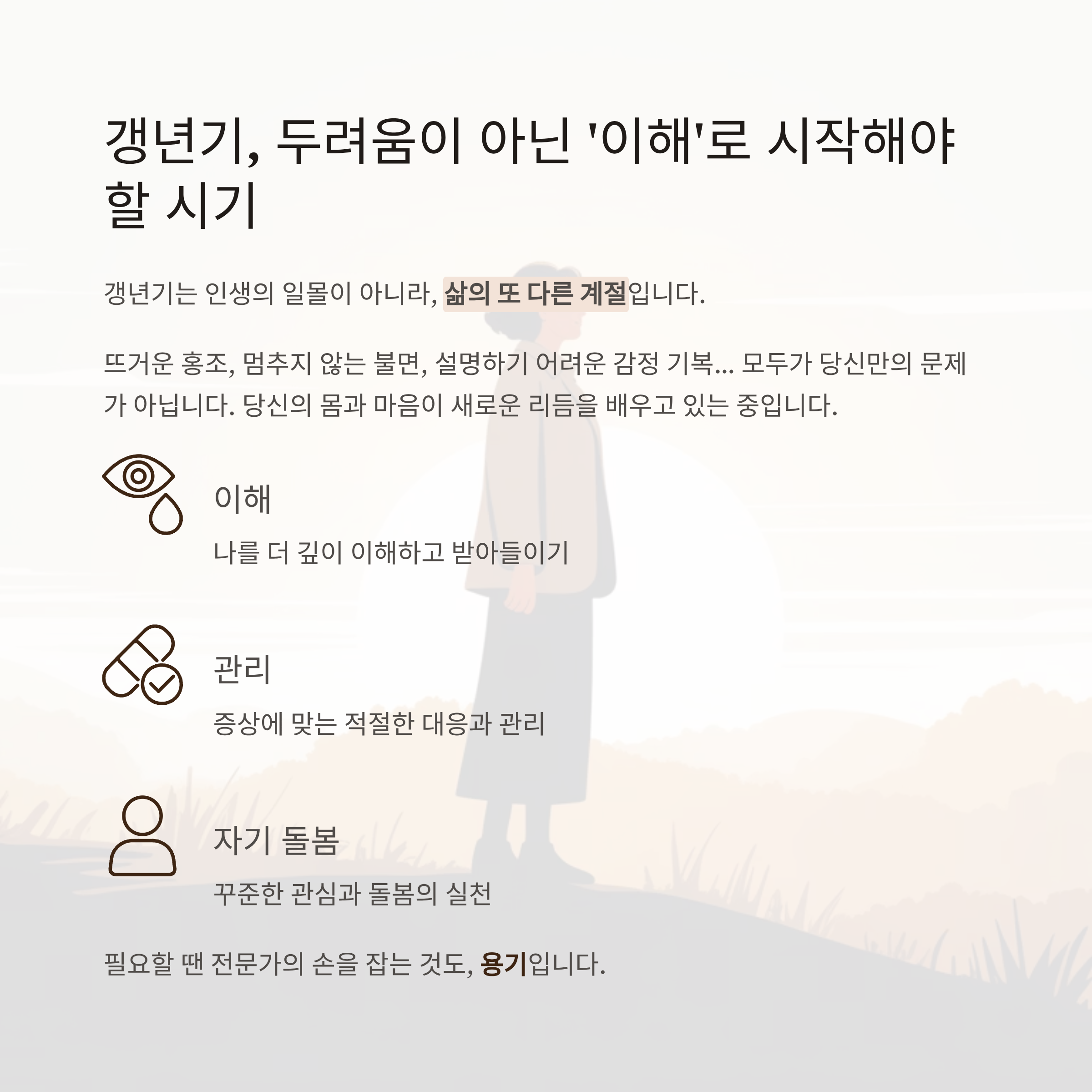이 시기를 덜 고통스럽게, 더 건강하게 보내기 위해 필요한 것은 이해와 관리, 그리고 꾸준한 자기 돌봄입니다.