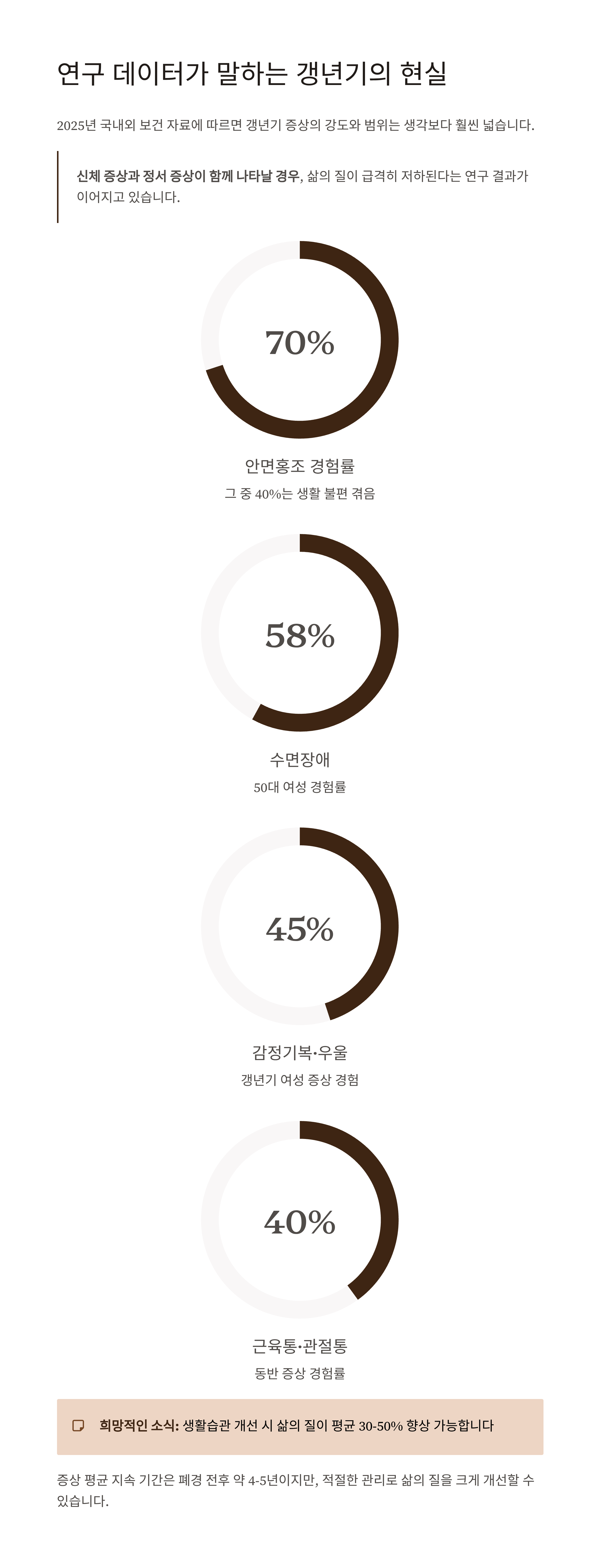 2025년 국내외 보건 자료에 따르면 갱년기 증상의 강도와 범위는 생각보다 훨씬 넓습니다.