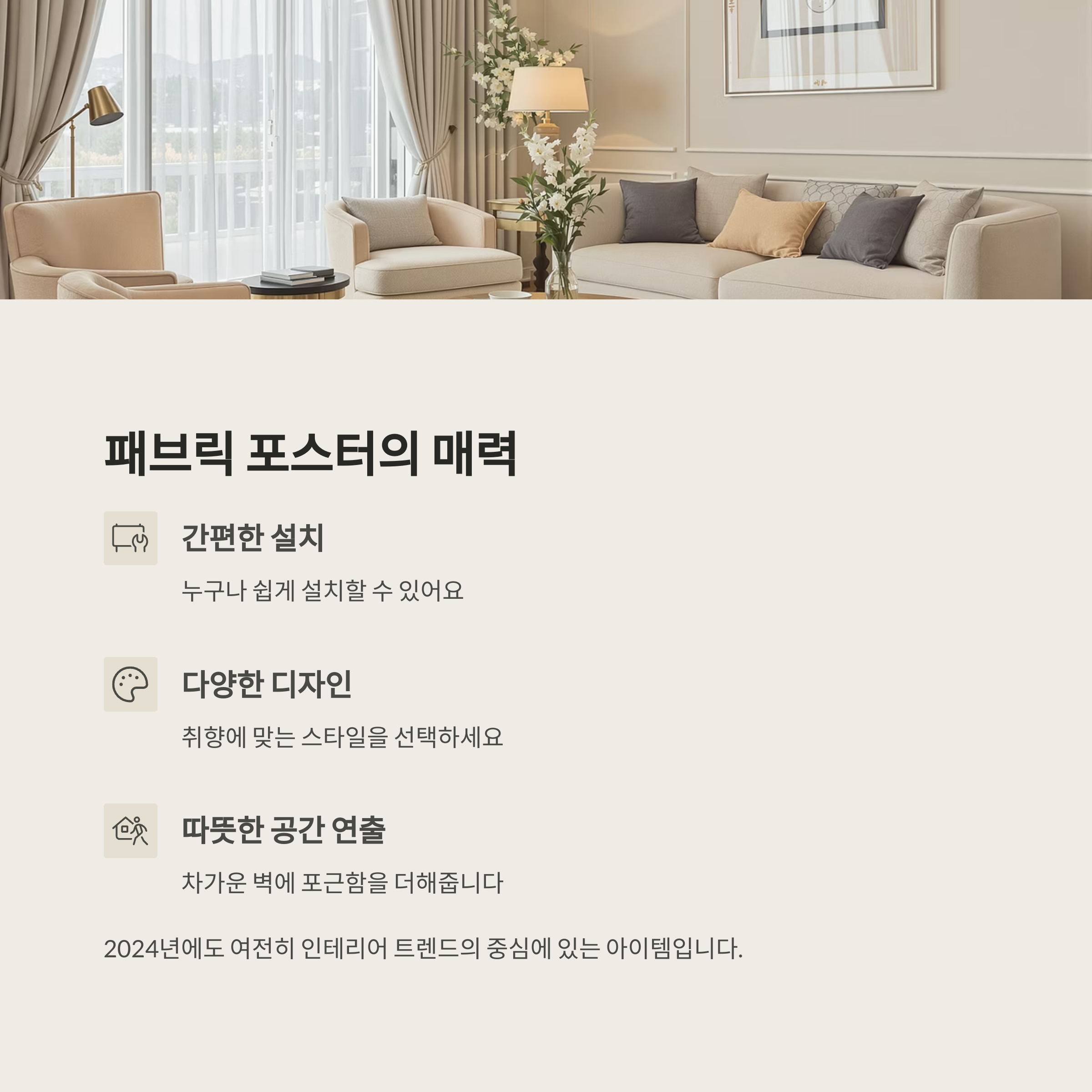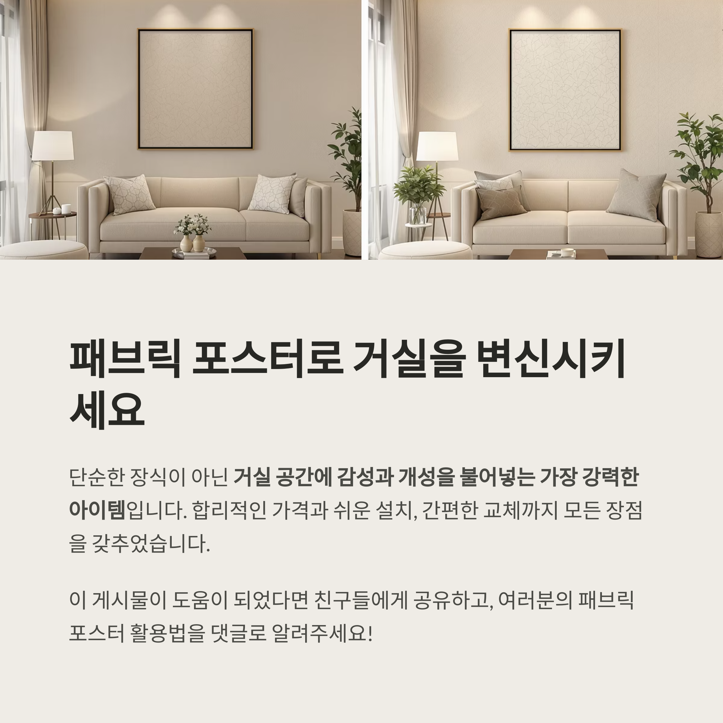 거실 분위기를 바꾸고 싶다면, 간단하면서도 강력한 변화 요소로 패브릭 포스터를 활용해보세요