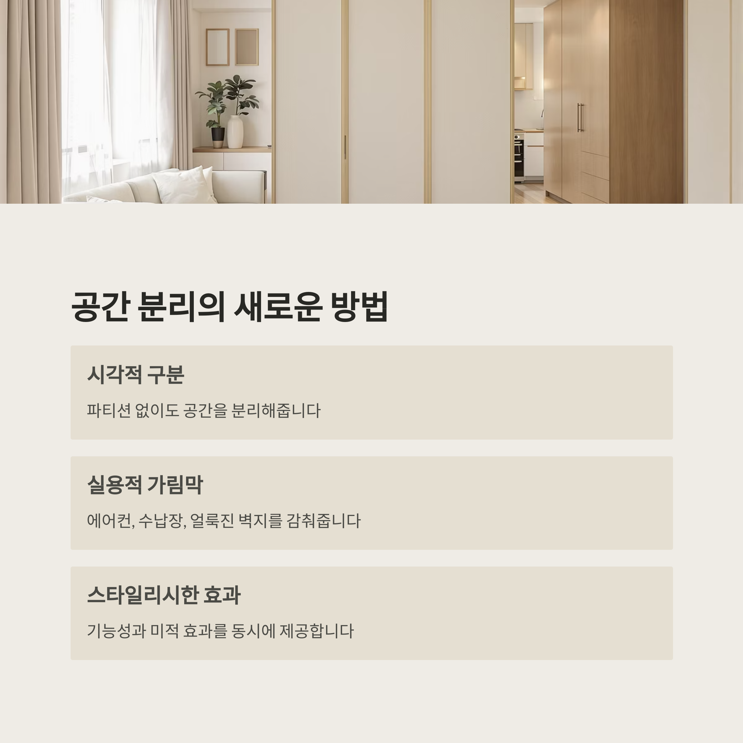 또한 에어컨, 수납장, 얼룩진 벽지 등 가리고 싶은 부분을 자연스럽게 덮어주는 기능까지 겸하고 있어