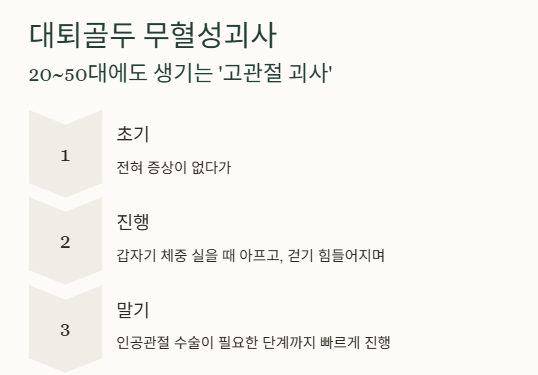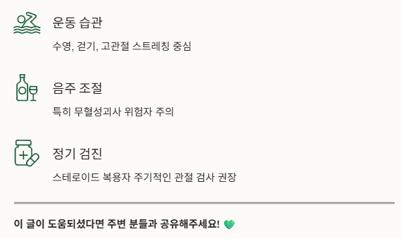 | 장기 스테로이드 복용 | 대퇴골두 괴사 위험 ↑ |