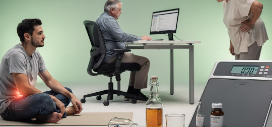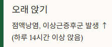 | 오래 앉기 | 점액낭염, 이상근증후군 발생 ↑ (하루 14시간 이상 앉음) |