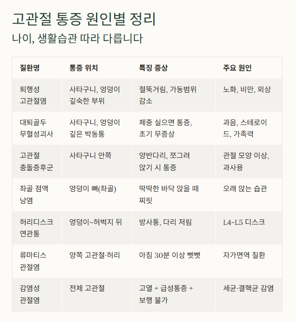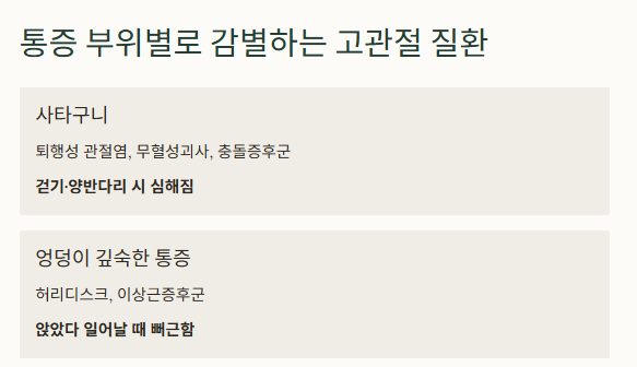 | 60대 이상 | 퇴행성 고관절염 가장 흔한 연령대 |