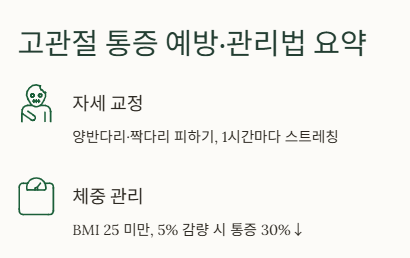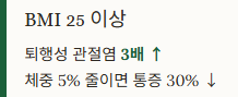 | BMI 25 이상 | 퇴행성 관절염 3배 ↑, 체중 5% 줄이면 통증 30% ↓ |