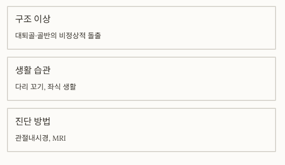 | 고관절 충돌증후군 | 사타구니 안쪽 | 양반다리, 쪼그려 앉기 시 통증 | 관절 모양 이상, 과사용 |