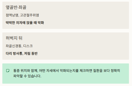 | 옆골반·좌골 | 점액낭염, 고관절주위염 | 딱딱한 의자에 앉을 때 악화 |