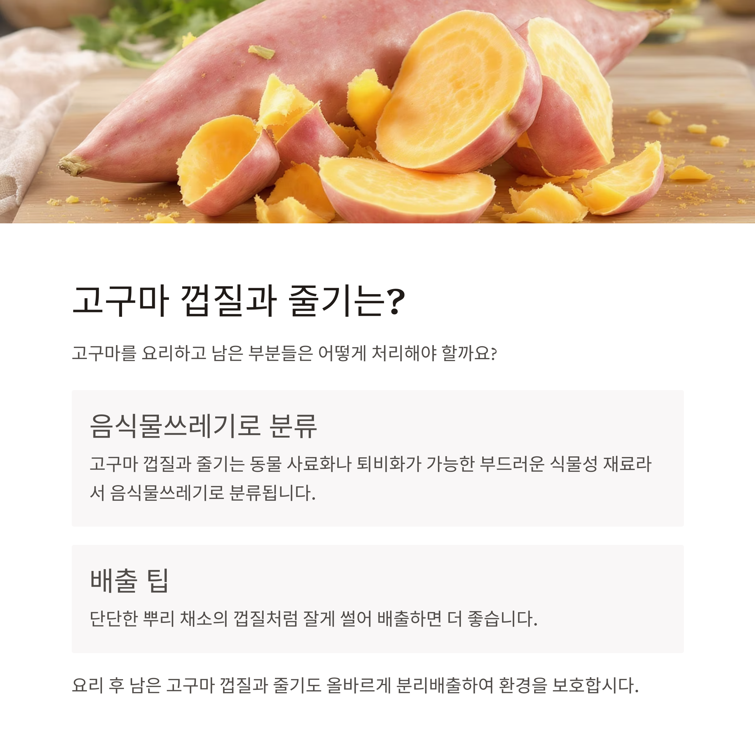 고구마 껍질과 줄기 또한 동물 사료화나 퇴비화가 가능한 부드러운 식물성 재료라서 음식물쓰레기로 분류됩니다. 단단한 뿌리채소의 껍질처럼 잘게 썰어 배출하면 더 좋습니다.