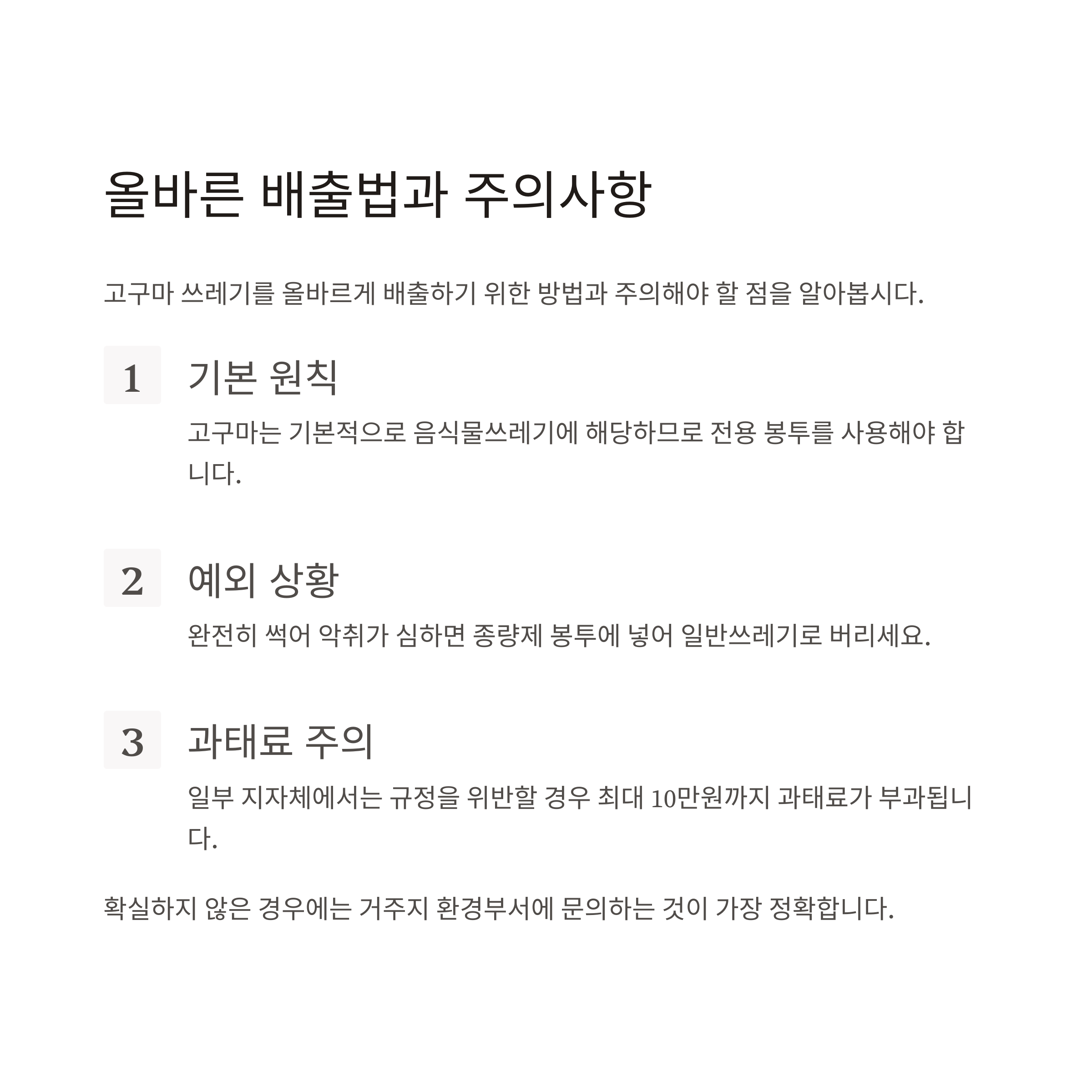 대부분의 상한 고구마는 음식물쓰레기에 해당하지만, 곰팡이가 심하고 악취가 나는 상태라면 일반쓰레기로 구분해 버려야 합니다. 지자체마다 세부 지침이 다를 수 있으니 헷갈린다면 환경부서에 확인하세요. 정확히 분리해 배출해 과태료를 피하고, 환경보호에도 동참해 보세요.