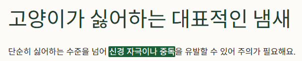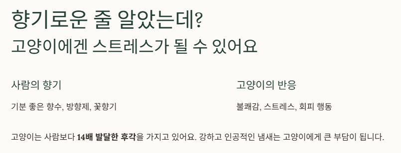 | 향수·디퓨저·세제 향 | 인공 플로럴향, 바디제품 향은 고양이에게 스트레스 유발 가능 |