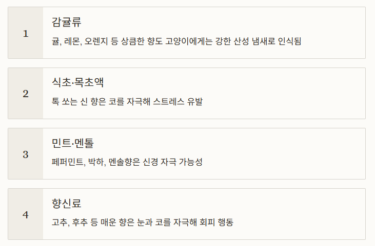 | 유칼립투스·소나무 향 | 특정 식물 계열 향도 고양이 후각에 과하게 자극적임 |