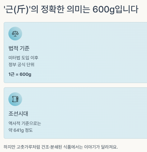 | 법정근 | 전통 공식 단위 기준 | 600g | 법적 기준, 포장 상품에서 사용 |