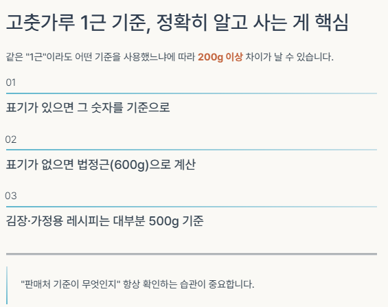 다음은 헷갈리기 쉬운 고춧가루 단위별 기준을 한눈에 정리한 표입니다.