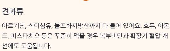 호두, 아몬드, 피스타치오 등은 꾸준히 먹을 경우 복부비만과 확장기 혈압 개선에도 도움 됩니다.