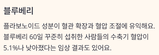 블루베리 60일 꾸준히 섭취한 사람들의 수축기 혈압이 5.1%나 낮아졌다는 임상 결과도 있어요.