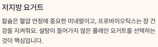 칼슘은 혈압 안정에 중요한 미네랄이고, 프로바이오틱스는 장 건강을 지켜줘요.