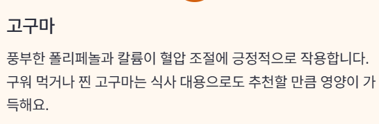 | 점심 | 고구마 구이 + 시금치 나물 + 토마토 샐러드 | 칼륨, 마그네슘, 비타민 |