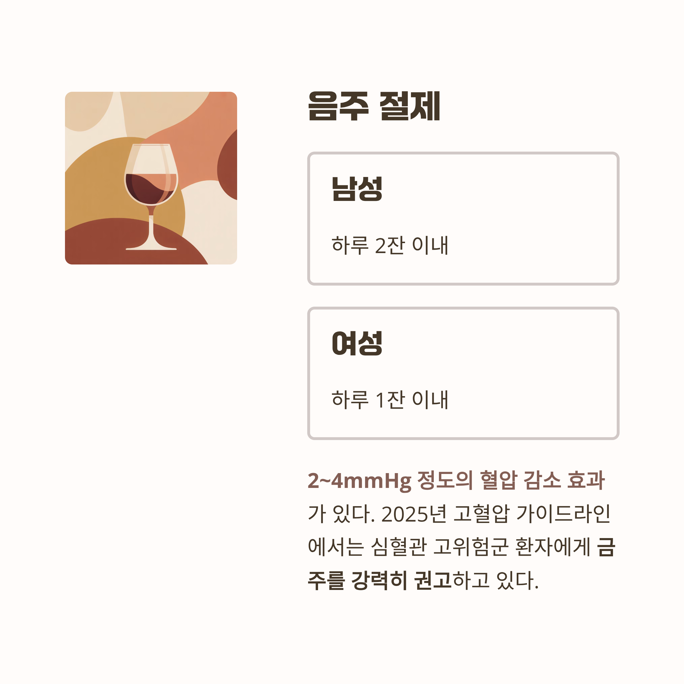 2025년 고혈압 가이드라인에서는 심혈관 고위험군 환자에게 금주를 강력히 권고하고 있다.