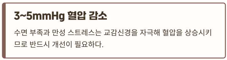 | 수면·스트레스 | 6~8시간 수면 + 스트레스 완화 | 3~5 mmHg ↓ |