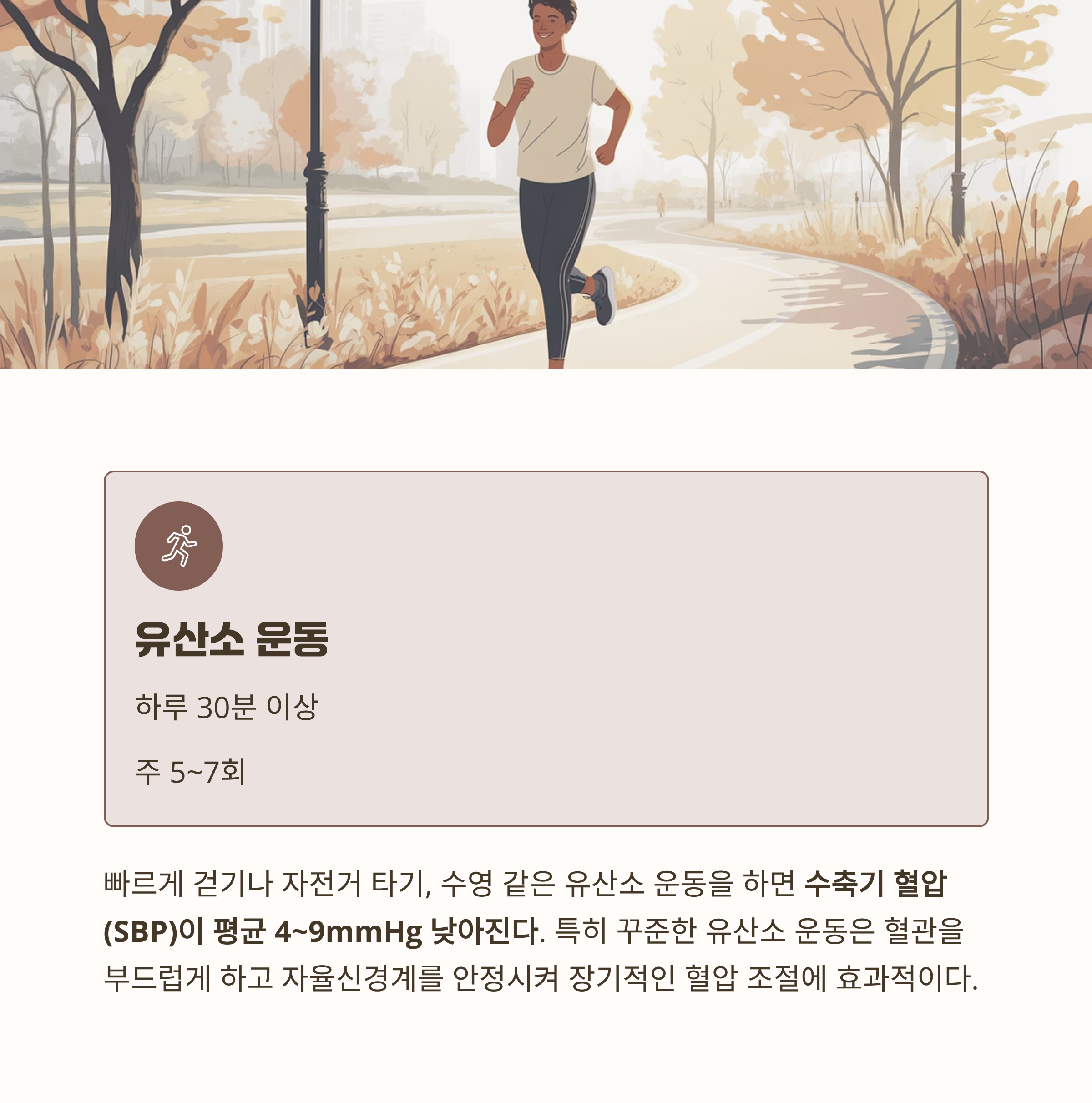 | 유산소 운동 | 하루 30분, 주 5~7회 | 4~9 mmHg ↓ |