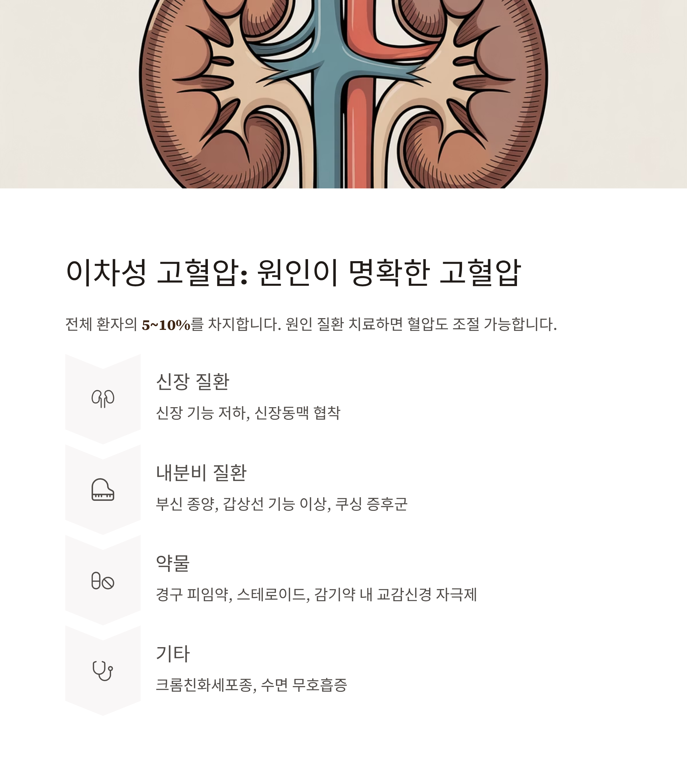 특정 질환이나 약물 복용이 원인이 되며, 원인 질환을 치료하면 혈압도 조절될 수 있습니다.