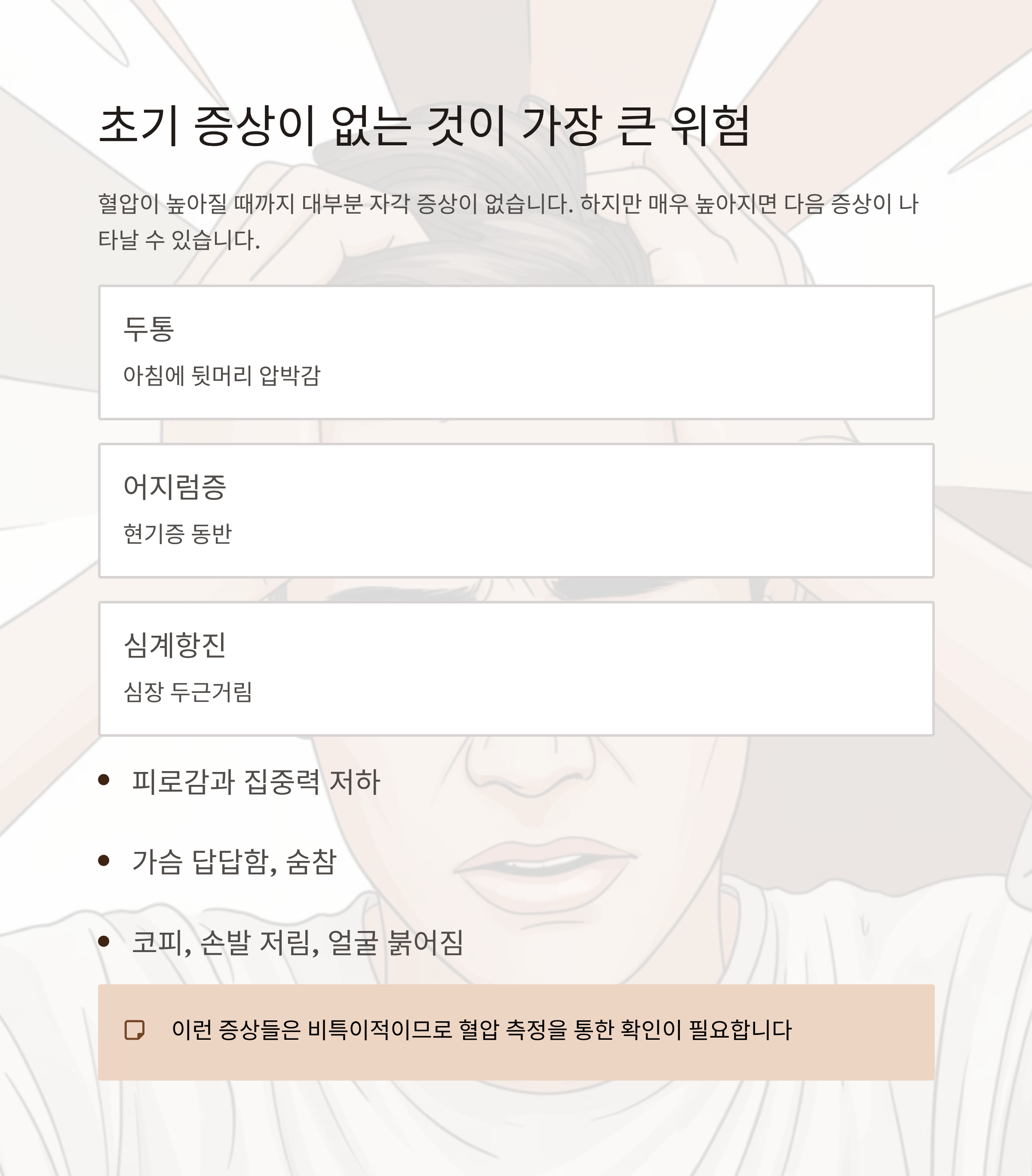 '침묵의 살인자'라는 별명처럼, 혈압 수치가 상당히 높아질 때까지 대부분 특별한 자각 증상이 없습니다.