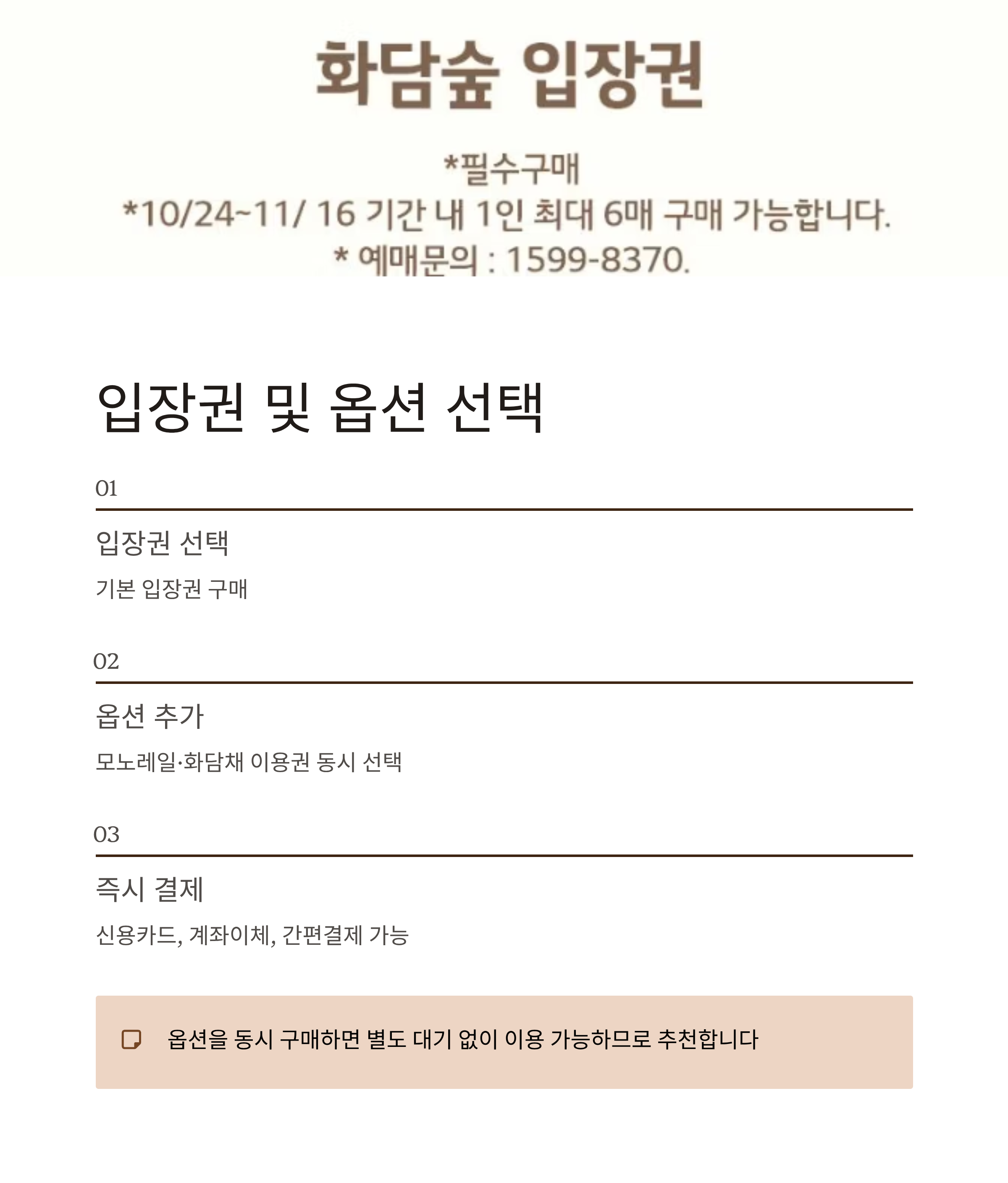 • 입장권 외에 모노레일·화담채(식음 공간) 이용권을 함께 선택할 수 있습니다.