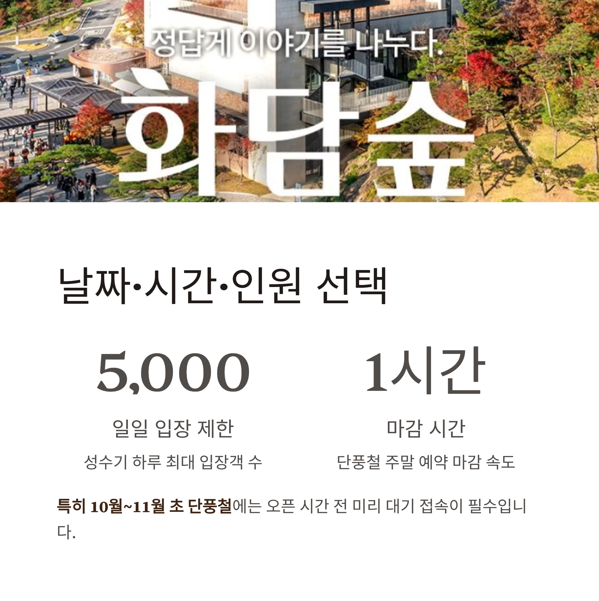 • 특히 단풍철(10월~11월 초) 주말 예약은 오픈 후 1시간 내 마감되는 경우도 많습니다.