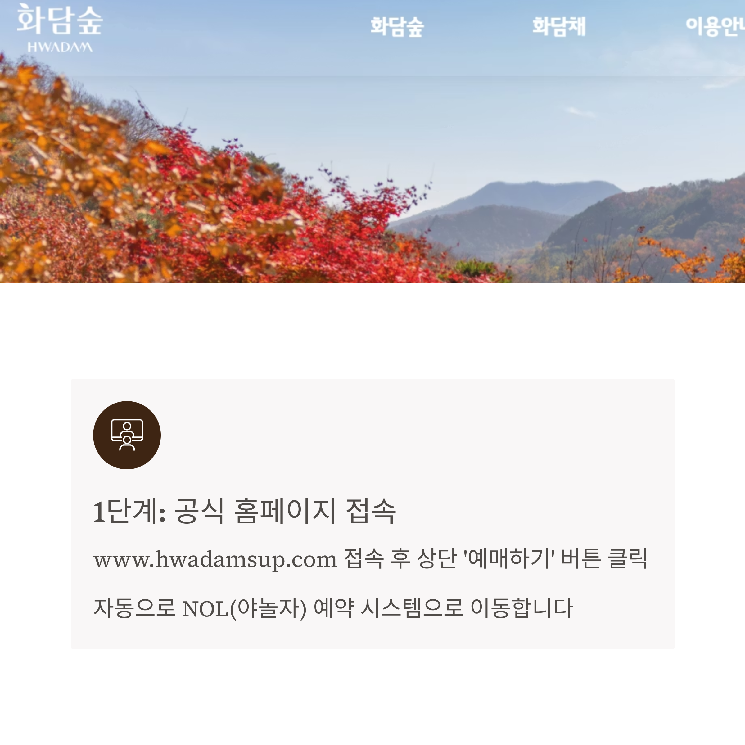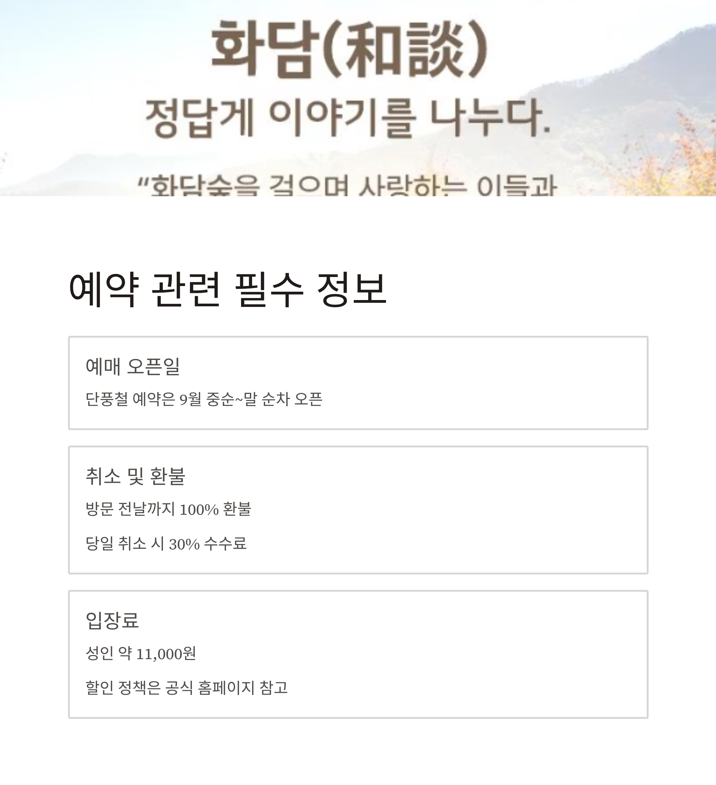 - 특히 단풍철(10월~11월 초) 주말 예약은 오픈 후 1시간 내 마감되는 경우도 많습니다.