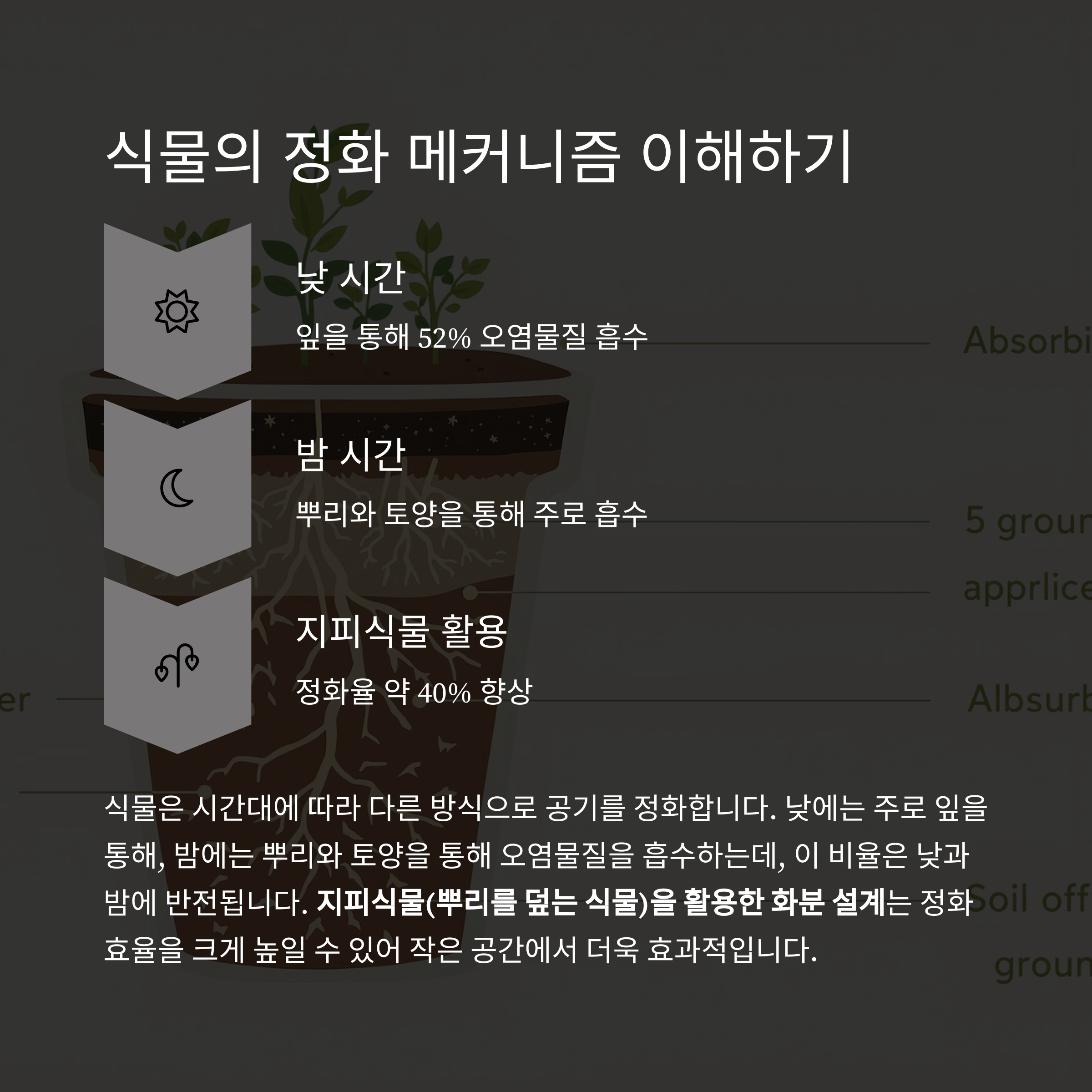 식물은 낮에는 잎을 통해, 밤에는 뿌리와 토양을 통해 오염물질을 흡수합니다.